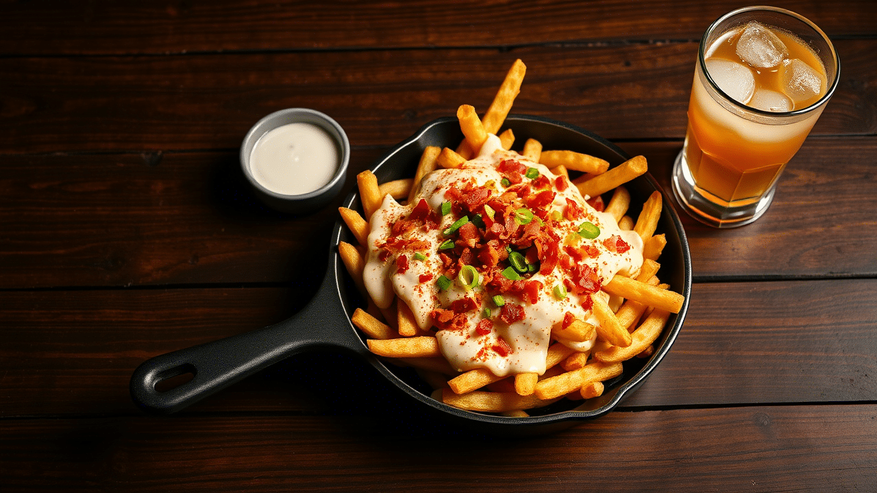Plate the fries on a rustic wooden board or in a cast iron skillet for dramatic effect. Garnish with fresh chopped scallions or parsley for color pop.